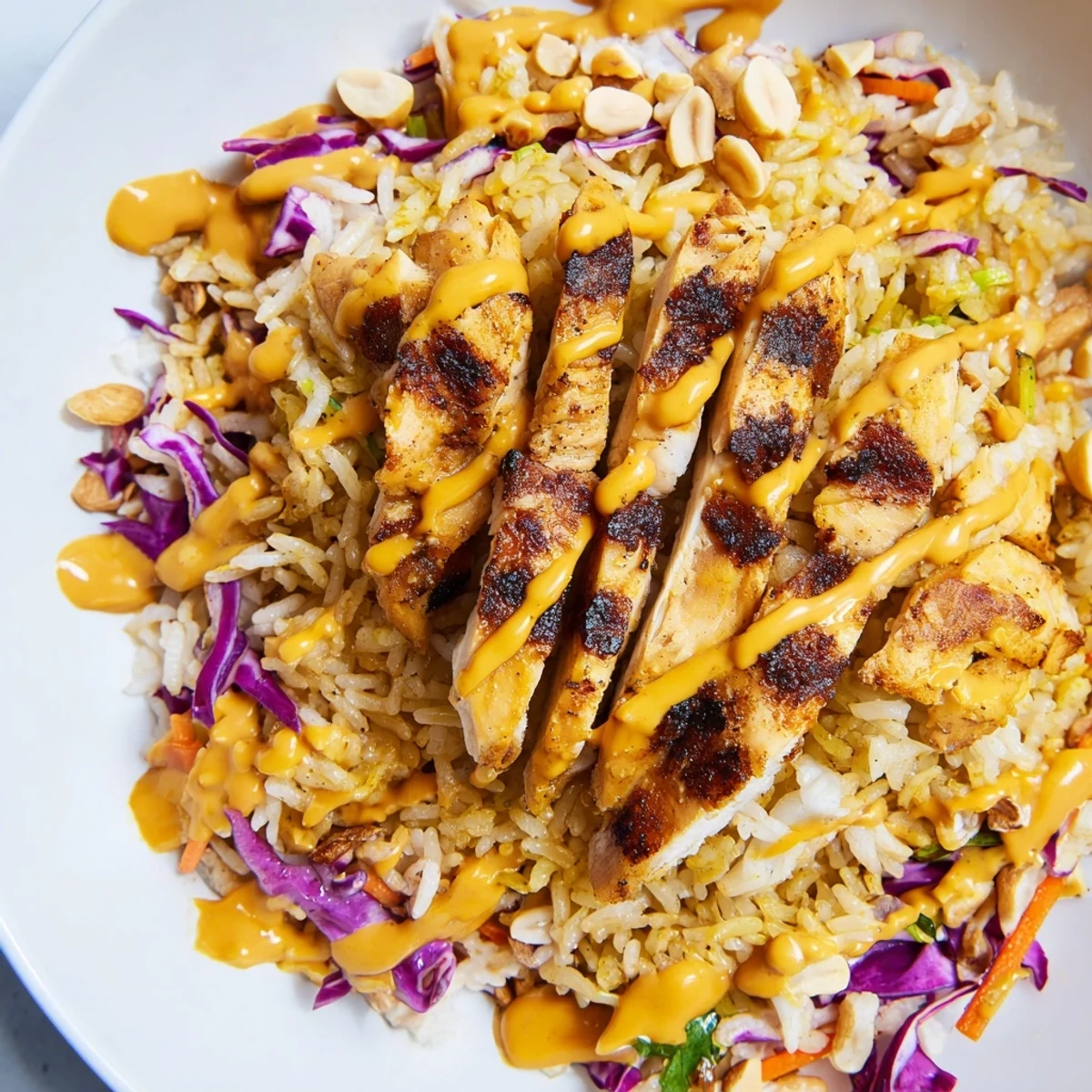 Prepare components separately ahead—marinate chicken, cook crispy rice, whisk sauce. Assemble just before serving to maintain the crispy rice texture and fresh vegetable crunch.