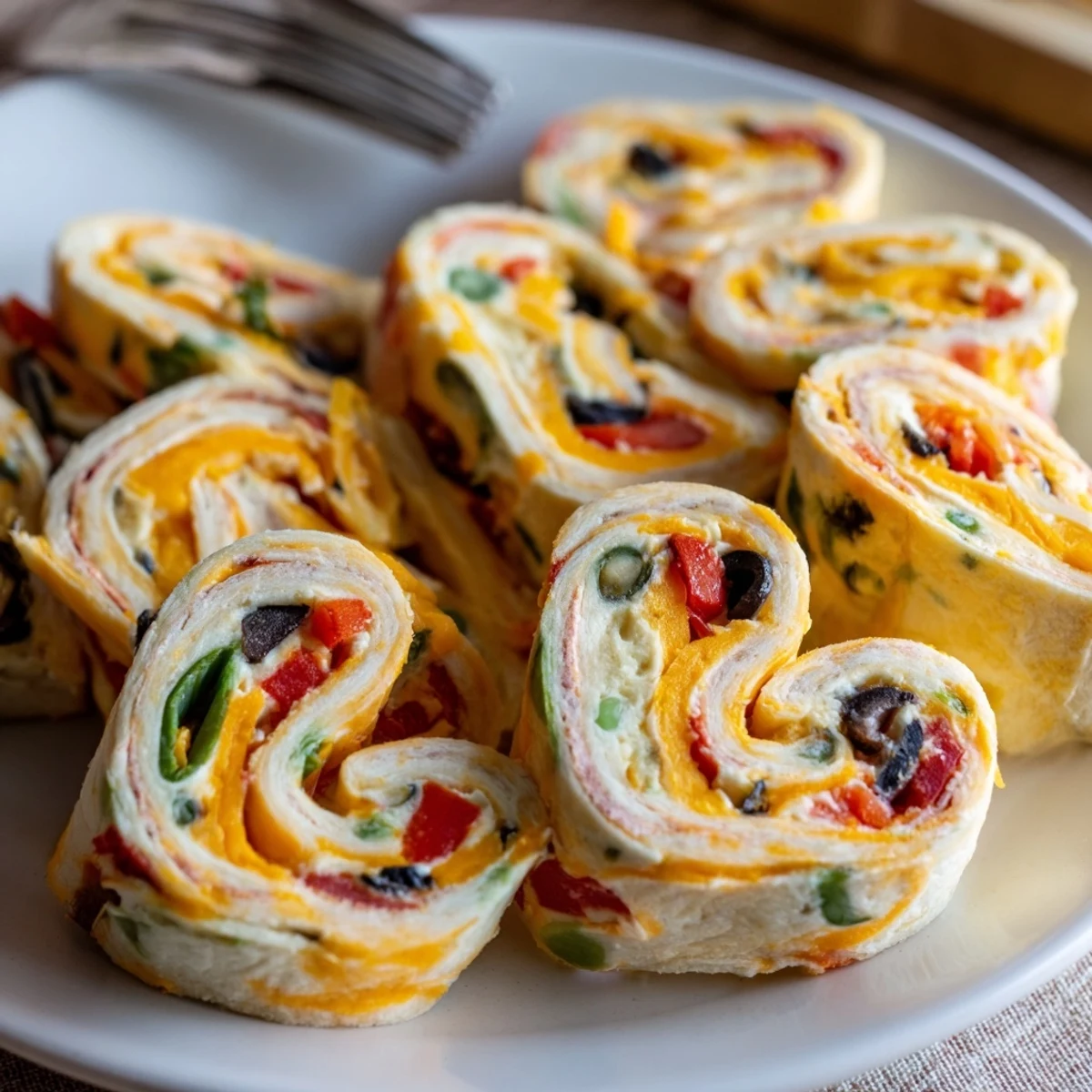 These colorful tortilla pinwheels feature a creamy, savory spread made with cream cheese, sharp cheddar, diced red bell peppers, green onions, and olives. The filling comes together in minutes and gets rolled inside soft flour tortillas for an impressive presentation.