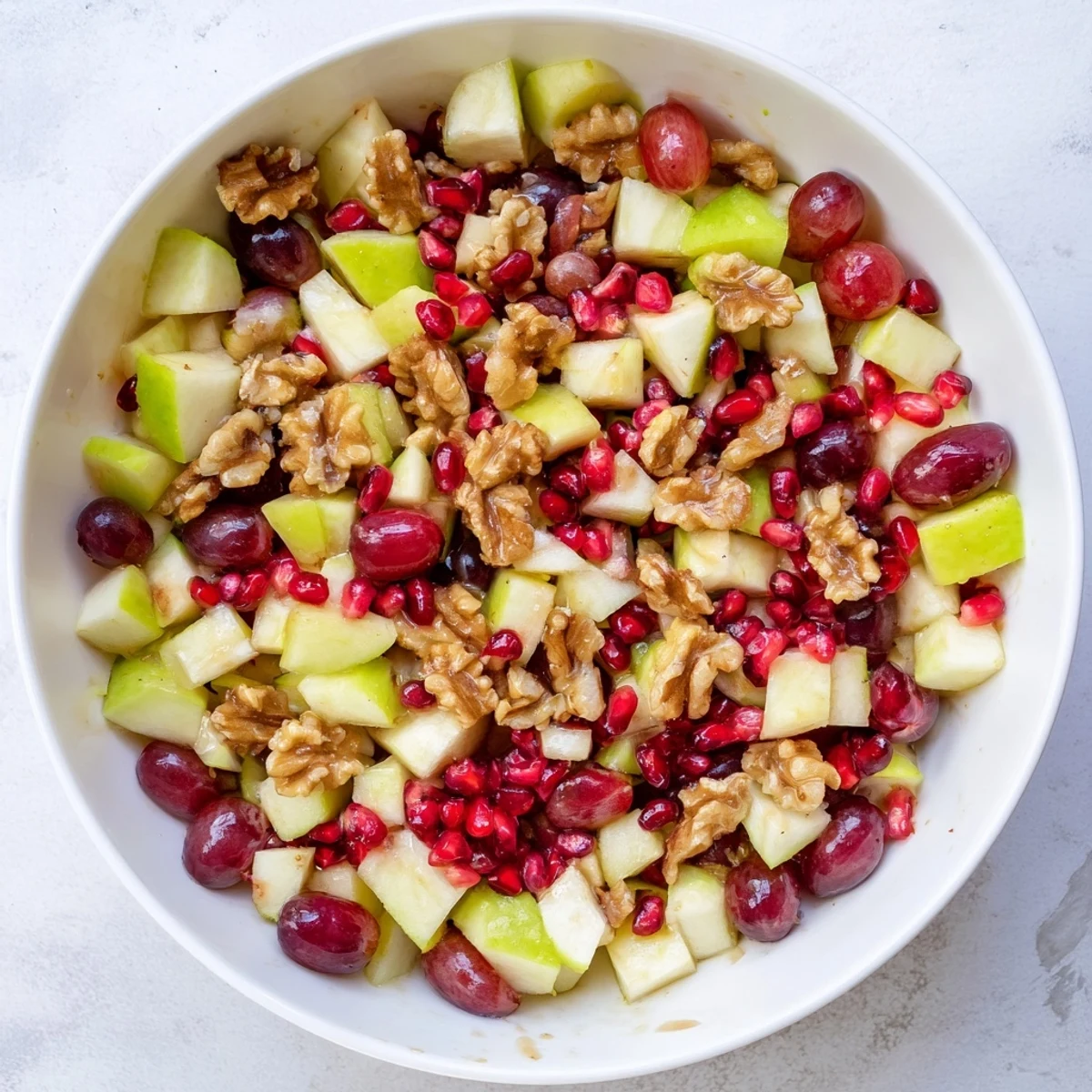 - In a large bowl, toss together the apple, pear, grapes, pomegranate seeds, dried cranberries, and chopped walnuts until evenly distributed.