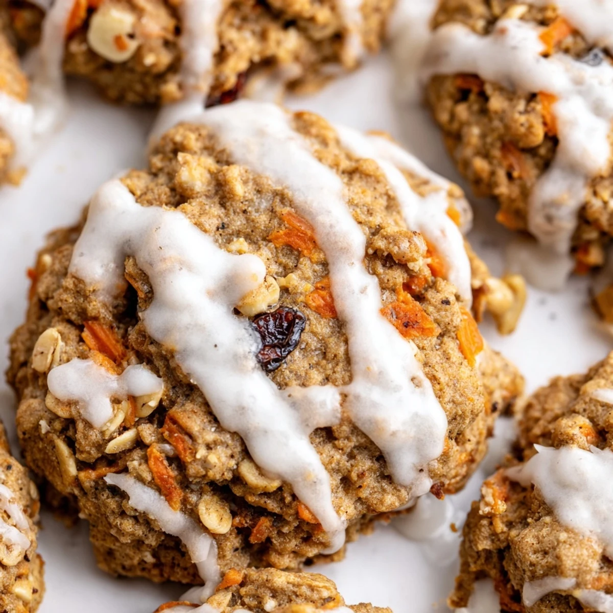 These soft and chewy cookies capture all the flavors of classic carrot cake in a handheld treat. Loaded with freshly grated carrots, warm cinnamon, nutmeg, and ginger, plus hearty oats and crunchy nuts for texture. The cream cheese drizzle adds a tangy sweetness that perfectly complements the spiced cookie base.