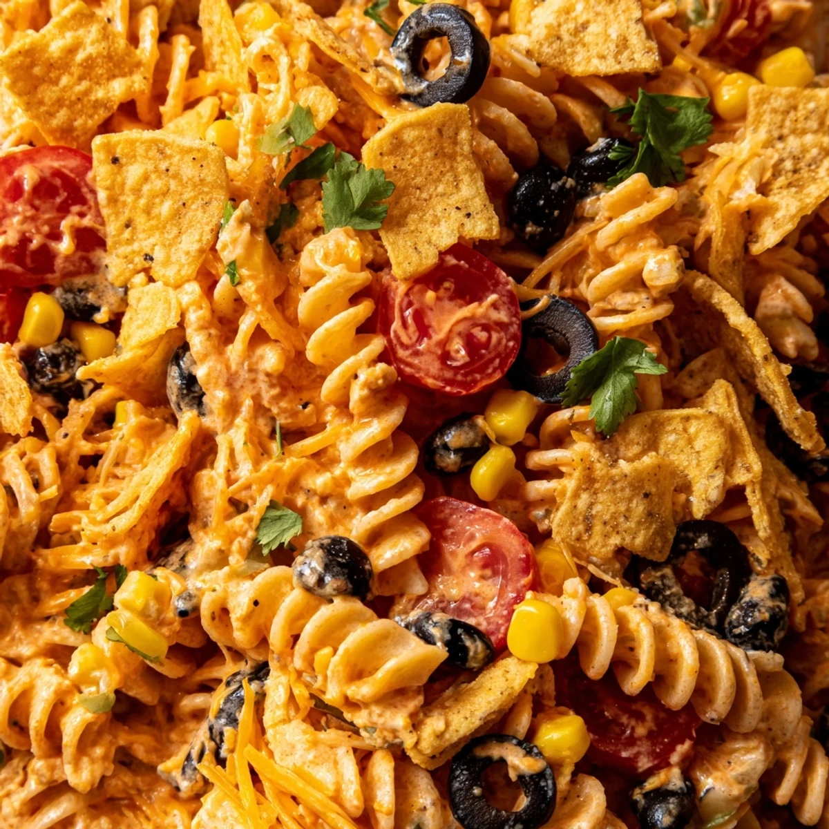 This vibrant Tex-Mex inspired dish combines rotini pasta with all your favorite taco ingredients. Ground beef or turkey joins cherry tomatoes, black beans, corn, and crisp vegetables in a tangy sour cream and mayonnaise dressing. The creamy zesty sauce ties everything together while crushed tortilla chips add satisfying crunch.
